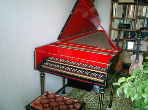 左側の二段鍵盤のチェンバロは、芦塚先生所有のグジョン・モデルのチェンバロです。