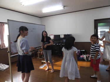斉藤先生と牧野先生がrecorderで音をピッと出して、風船の方向を教えます。音のpitchをちゃんと聞き分け出来ないと、先生の指示が分かりません。