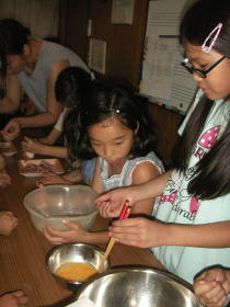 卵を付けて、衣を着せて・・さて・・・ 芦塚先生の合図で、 ハイ、みんなでいただきます!!
