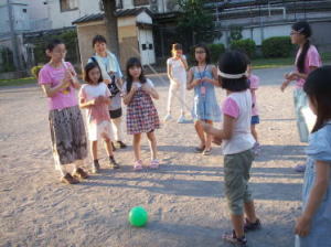 斉藤先生と牧野先生がrecorderで音をピッと出して、風船の方向を教えます。音のpitchをちゃんと聞き分け出来ないと、先生の指示が分かりません。